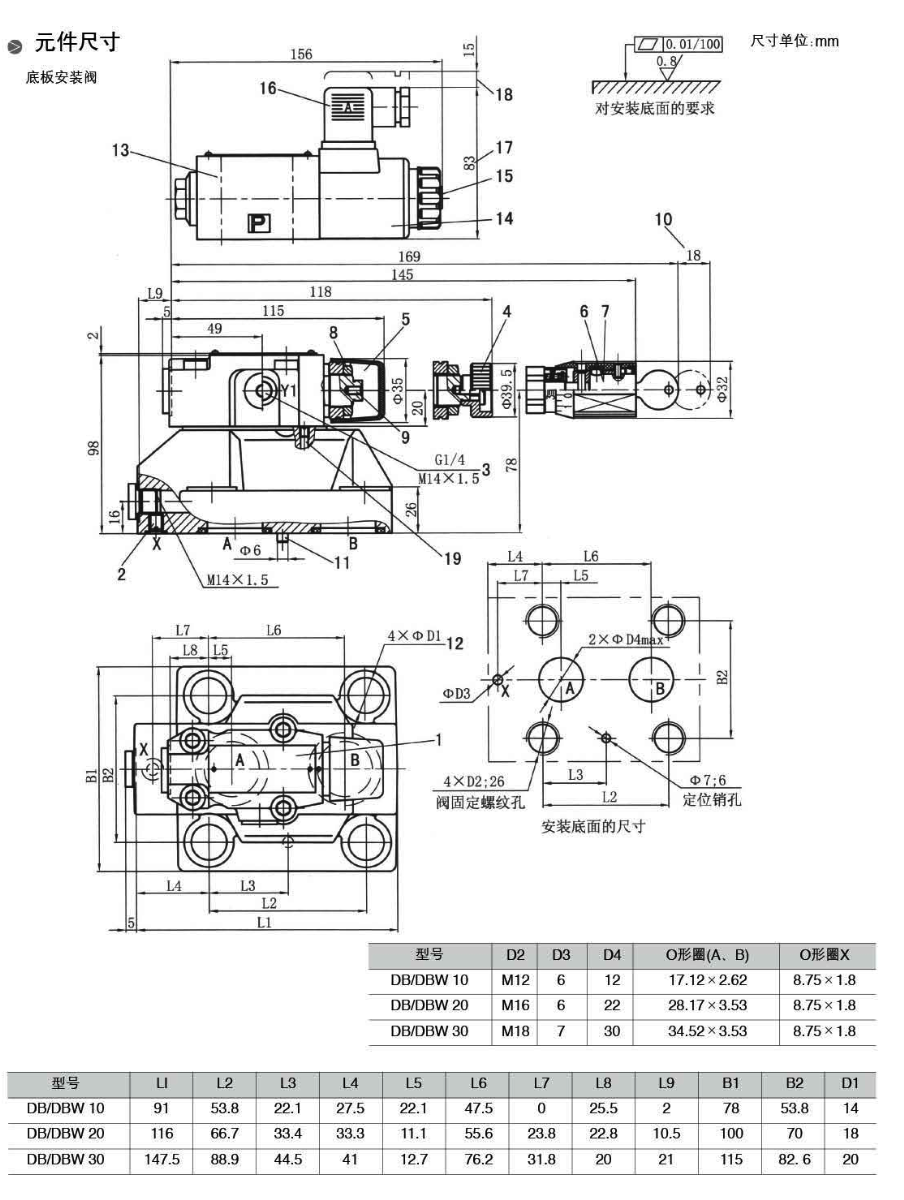 用于底板安裝,安裝面按DIN24340 E型,ISO 6264和CETOP-RP 121 H,用于螺紋連接,用于油路塊安裝。4種調(diào)整元件:①旋鈕②帶護(hù)罩的調(diào)節(jié)螺栓③帶刻度的有鎖旋鈕④帶刻度旋鈕。5種設(shè)定壓力,借助于安裝在其上的電磁方向閥操作卸荷??蛇x的切換時(shí)間延遲(僅DBW型)。
